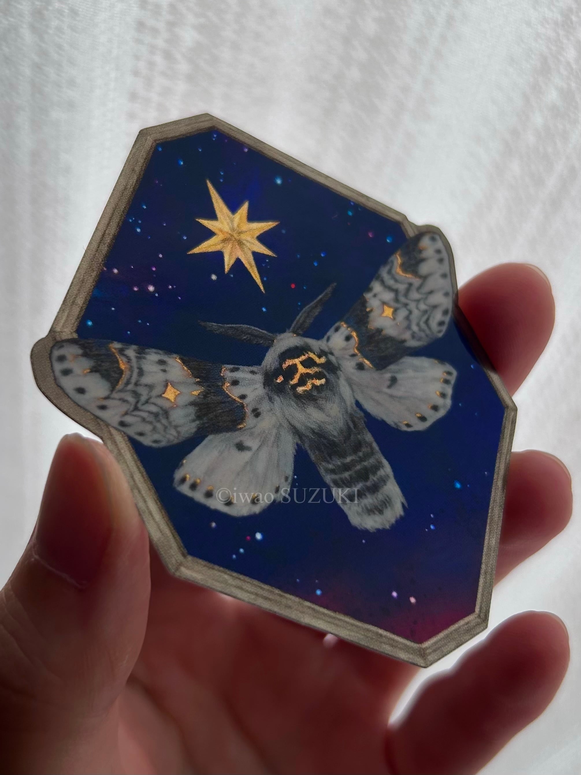サイズ:60mm 耐水 蛾の黄色い模様と星がキラキラと輝くステッカーです。スマホの裏にも挟めるサイズになっています。